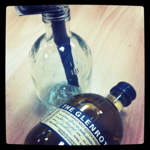 Y esta es la botella que me llegó, con su correspondiente mensaje (que no os voy a decir qué ponía… ¡claro, que no!) y su muestra de The Glenrothes, whisky que tuvimos ocasión de probar en una cata muy especial este verano pasado y que ha pasado a la lista de bebidas must para eventos muy especiales. ¡Chin, chin!